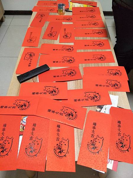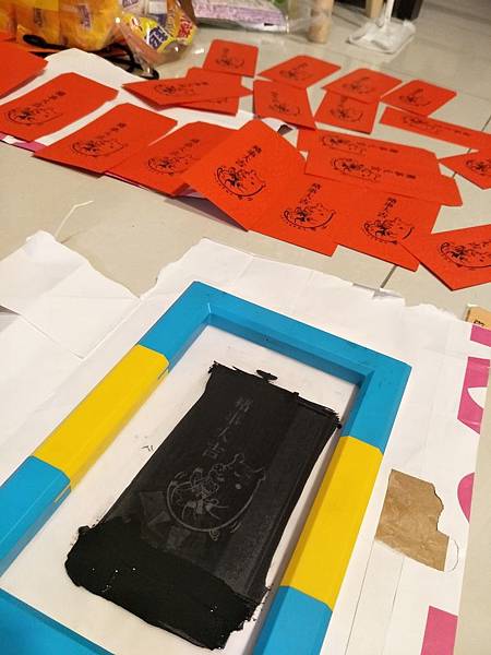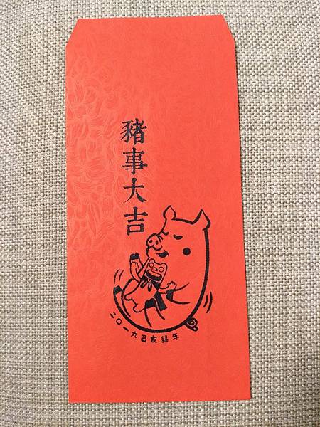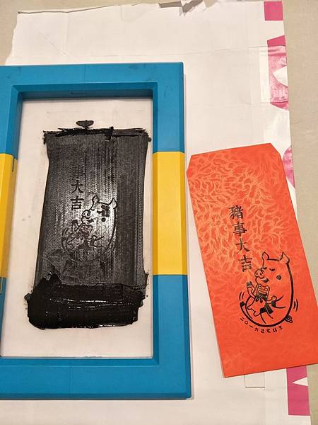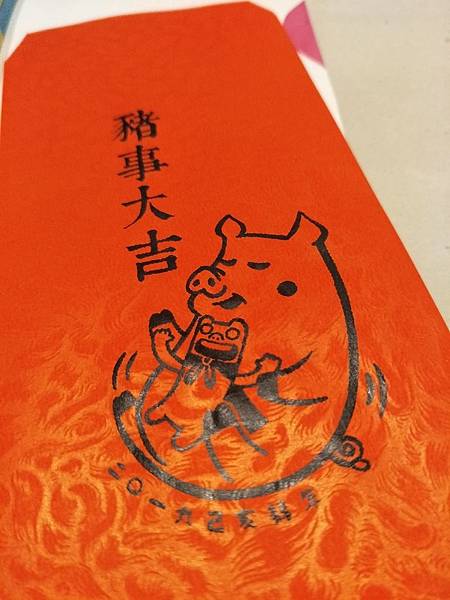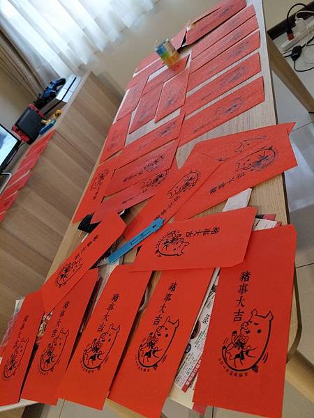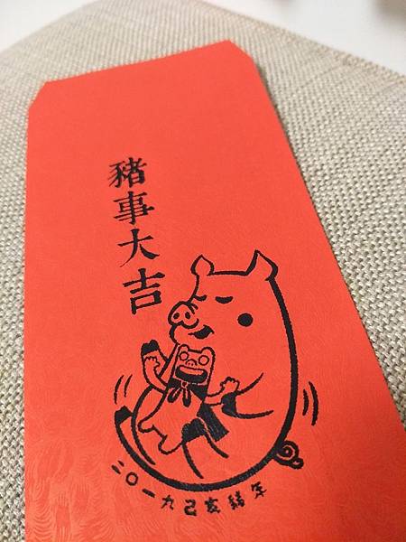 農曆新年即將到來, 為了應景己亥豬年, 刻意取諧音"豬獅大吉", 把風獅爺和豬畫在一起, 製成了網版印在紅包袋上, 第一次自己印紅包袋特別有成就感
