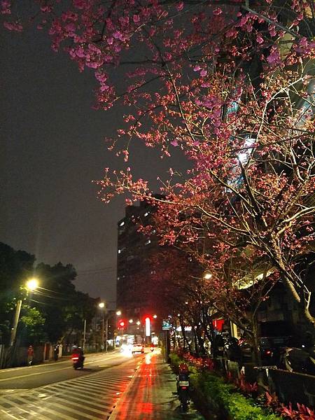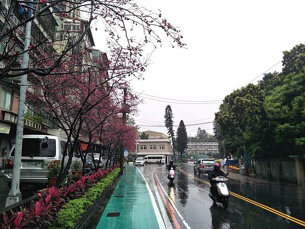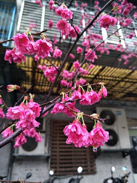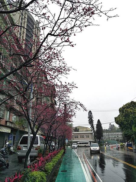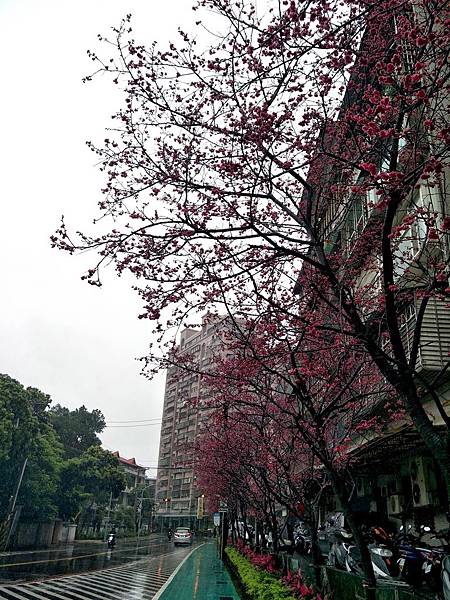 今年的櫻花又開了, 桃紅色的花朵在雨中多了幾分蕭瑟與寂寥